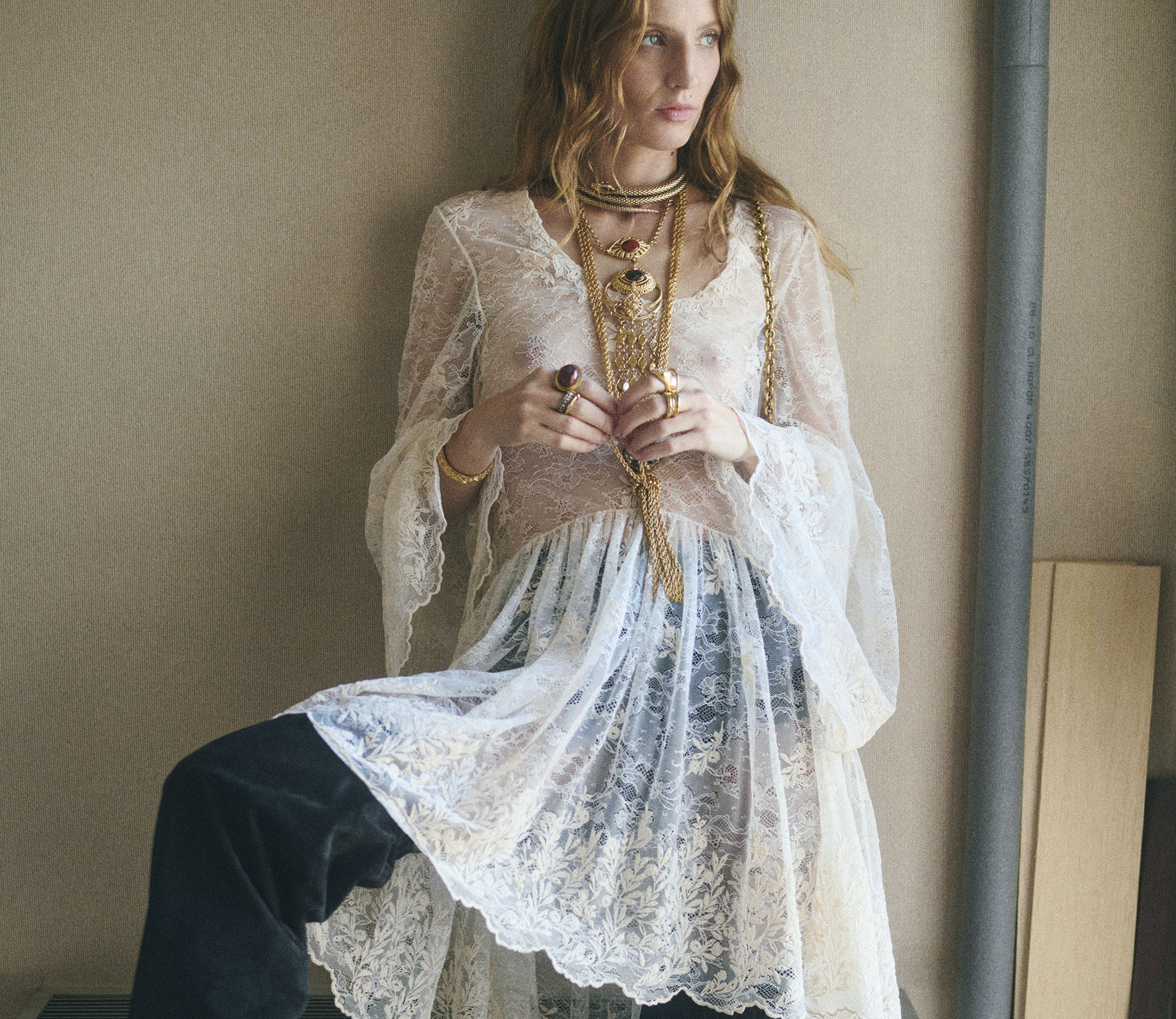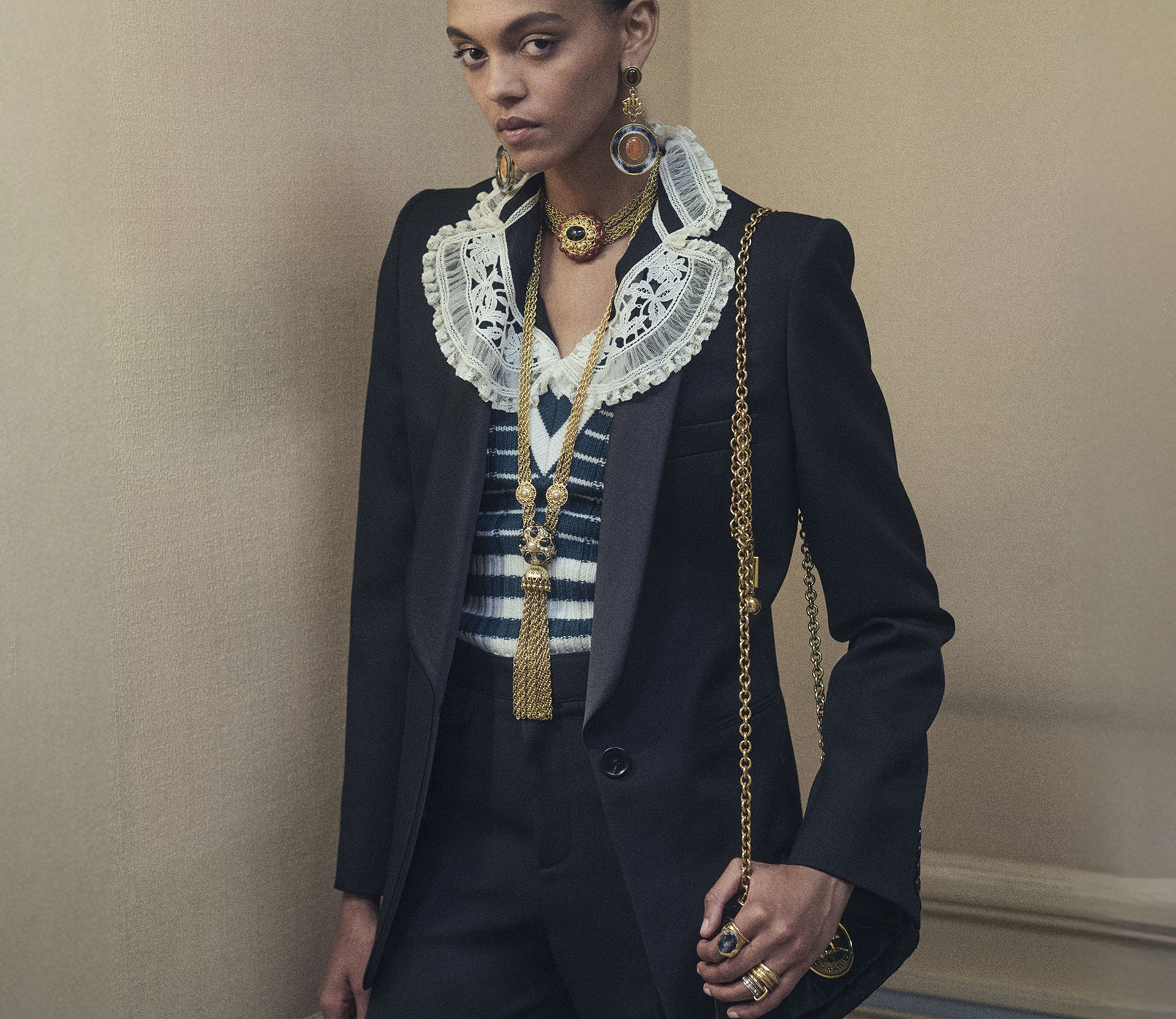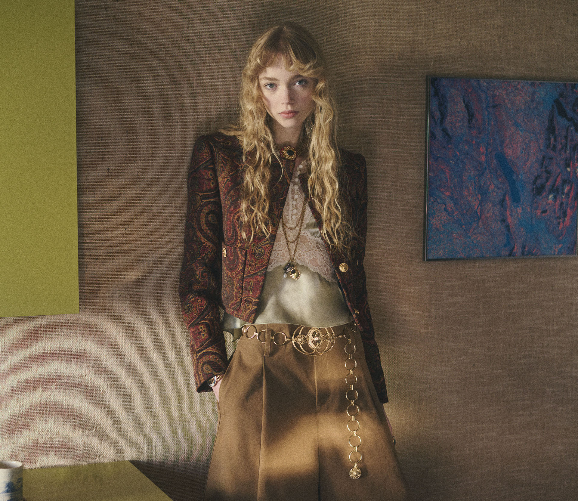 The Chloé Fall 2025 collection traverses different moods and eras, blending eccentricity and sensuality to celebrate the individuality of the Chloé woman. Her ever-evolving style is expressed through the juxtaposition of fabrics and layered silhouettes, including opulent silk jumpsuits paired with heritage-inspired outerwear—introducing original new shapes into the Chloé wardrobe.