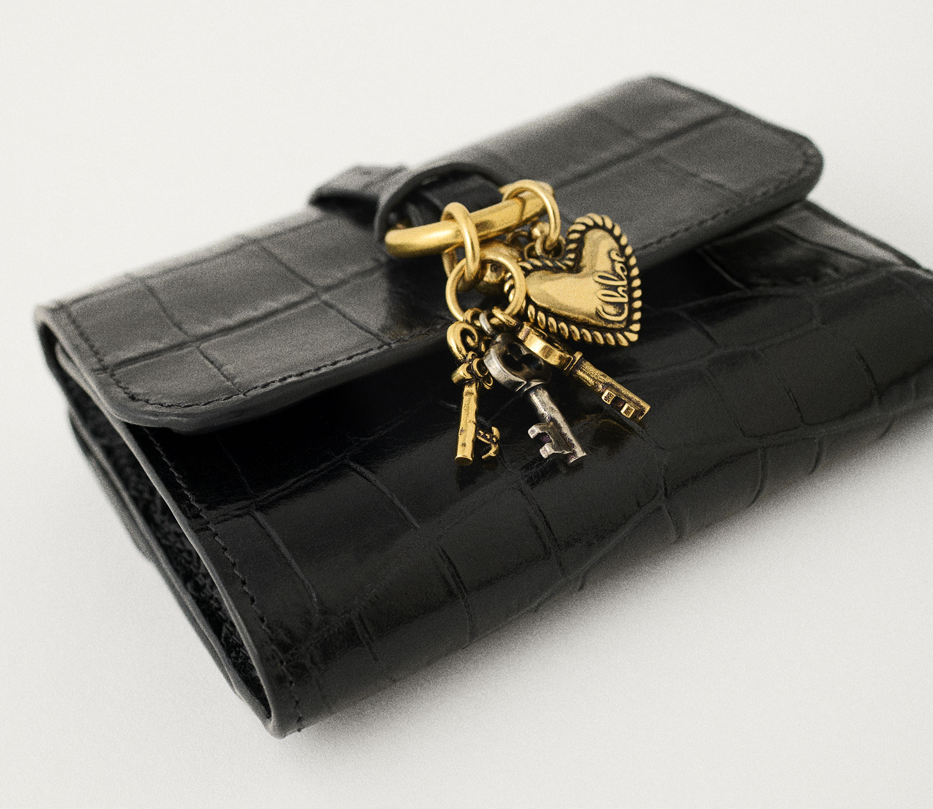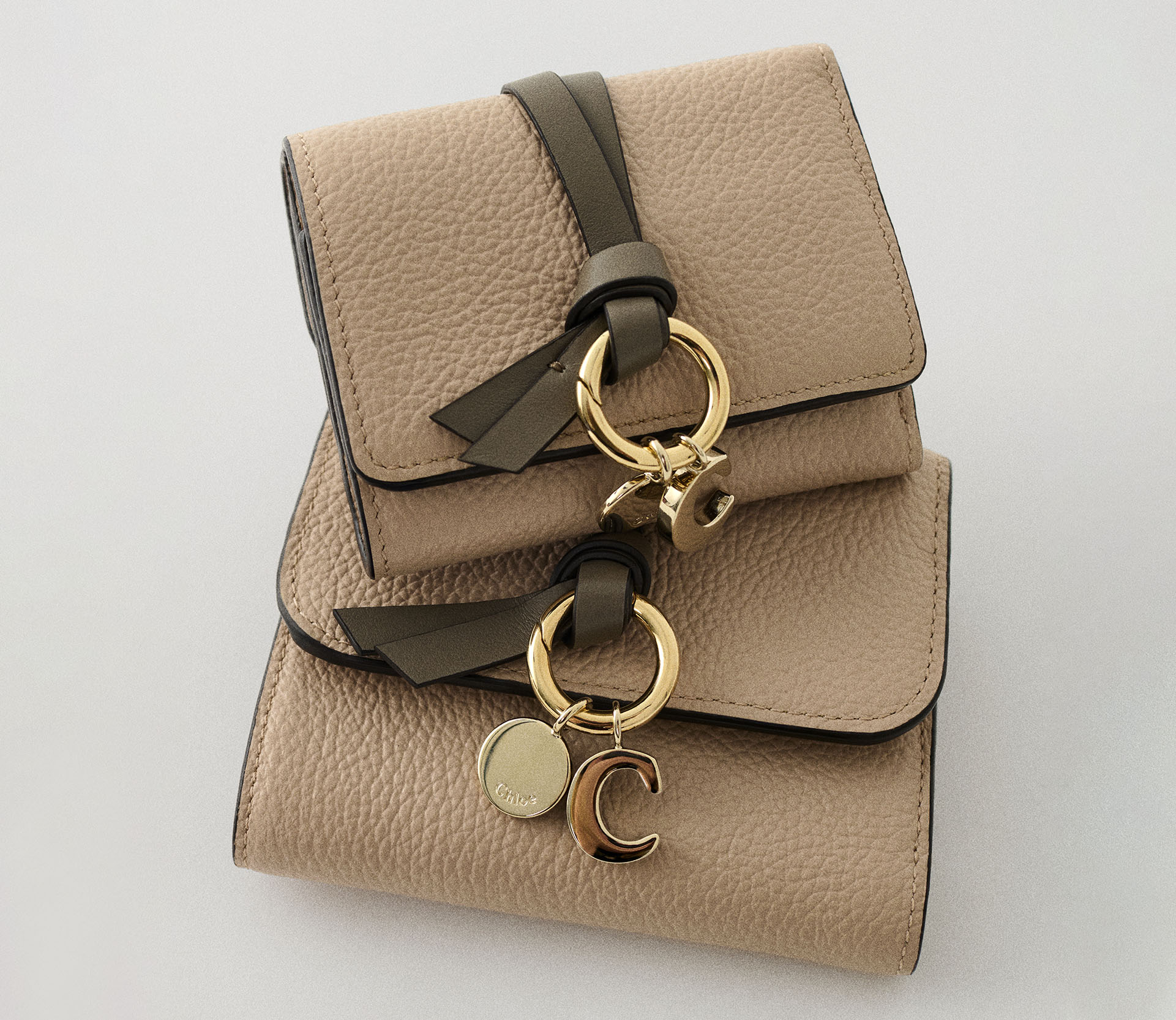 Chloé's small wallets combine functionality and elegance. Crafted from grained goatskin, the Enveloppe models are adorned with the signature horse medallion. The Paddington line echoes the aesthetic of the iconic bag, with its mini golden brass padlock and distinctive grained leather. The Alphabet wallets, customizable with charms, and the Chloé Iconic line, marked by its golden brass logo, illustrate the attention to detail cherished by the House.