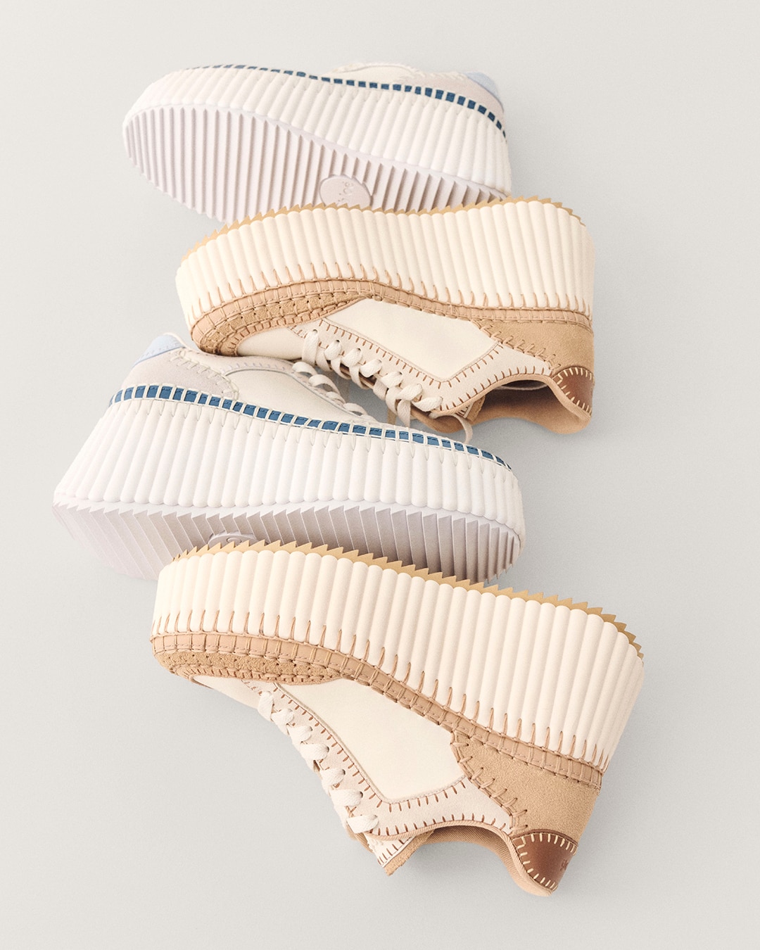 Las atrevidas zapatillas de deporte Nama de Chloé, culmen del confort, están íntegramente elaboradas con materiales de menor impacto, y el 40 % de su peso está compuesto por materiales reciclados. Este diseño respetuoso con el medioambiente posee una estética fresca y deportiva: la pala de malla cosida a mano sobre una distintiva suela estriada realza la artesanía auténtica de la Maison. Las zapatillas Nama, ligeras y realmente cómodas, son el compañero ideal para un estilo urbano de vanguardia y para los días de excursión.