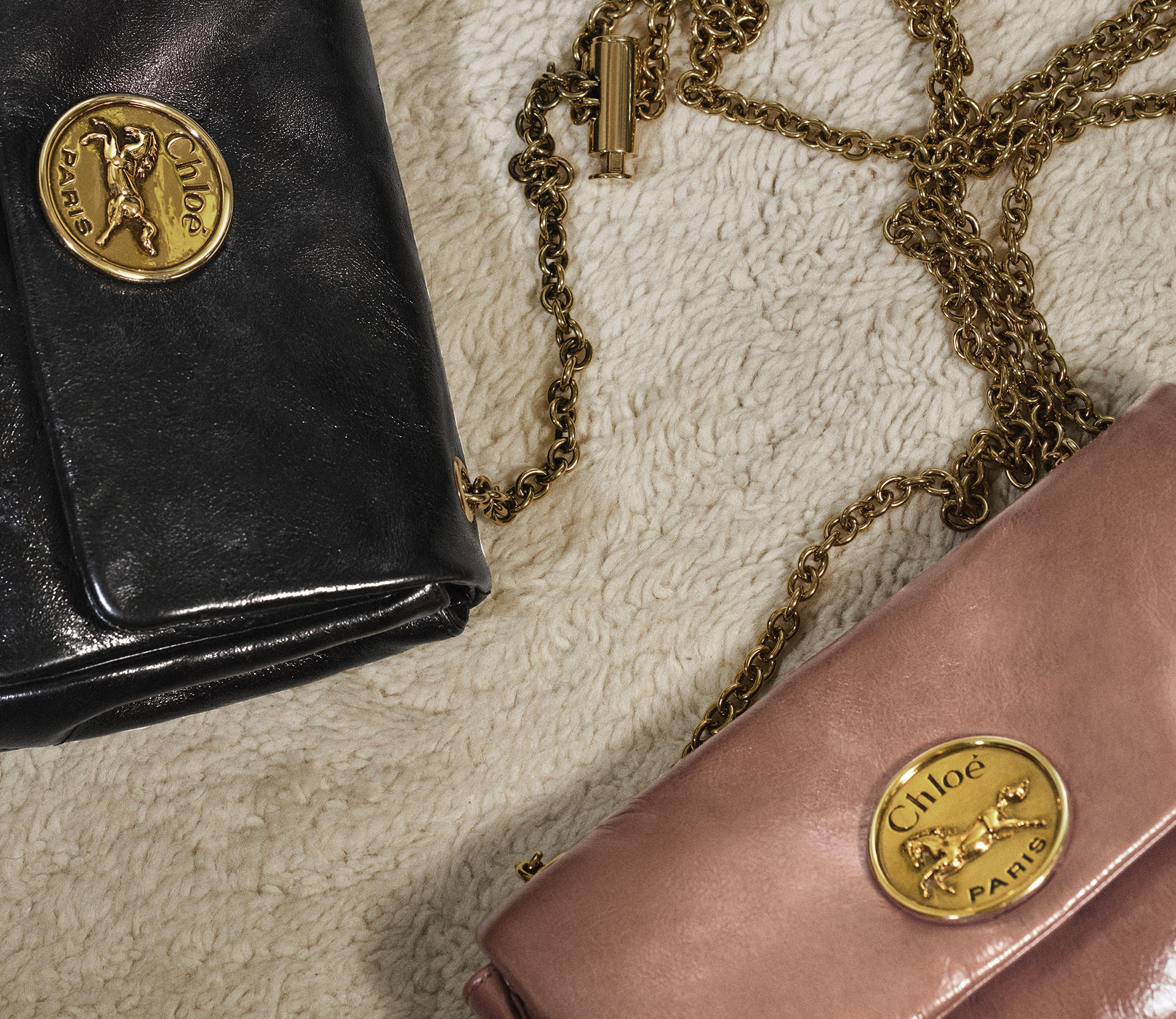 Caractérisée par sa souplesse et ses détails métalliques audacieux, la ligne Chloé Heritage incarne le jeu de contrastes emblématique de la Maison. Le médaillon Chloé, orné d'un motif de cheval au galop, se présente à la fois comme un ornement raffiné et un fermoir pratique.