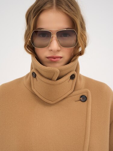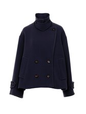 Cappotto corto doppiopetto oversize nell’iconica lana morbida, con cinturino sul collo e bottoni in corno.